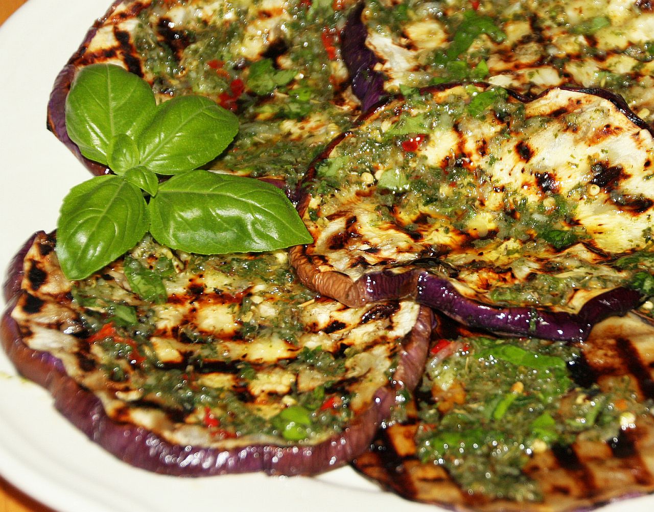 Pulire, asciugare e tagliare a fette le melanzane. Intanto in una pentola far bollire dell'acqua salata e immergervi le melanzane per un paio di minuti. A questo punto asciugarle e grigliarle. Intanto preparare un trito di aglio, prezzemolo, sale, pepe e abbondante olio. Versare l'emulsione appena creata sulle melanzane.