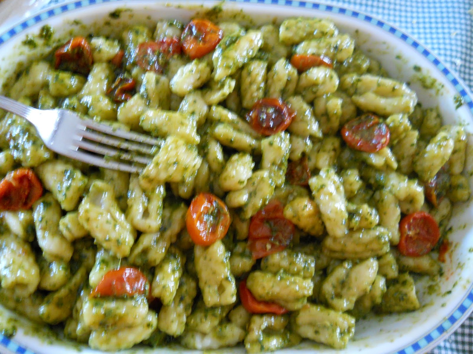 Frullare nel mixer i capperi, precedentemente lavati, con le olive e 2 cucchiai di olio d’oliva. Tagliare a metà i pomodorini e cuocerli in un soffritto di aglio e 2 cucchiai d’olio. Unire ai pomodorini la crema di olive e capperi e aggiungere un mestolino di acqua di cottura. Condire la pasta nella padella del sughetto, togliere dal fuoco, versarvi sopra la mozzarella tagliata a dadini. Lasciarla ammorbidire senza farla sciogliere del tutto. Aggiungere un filo d’olio, basilico e pepe.