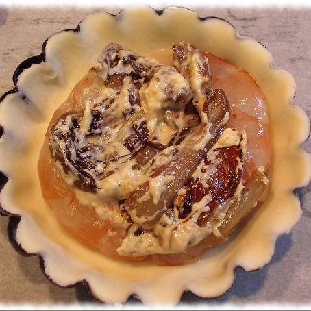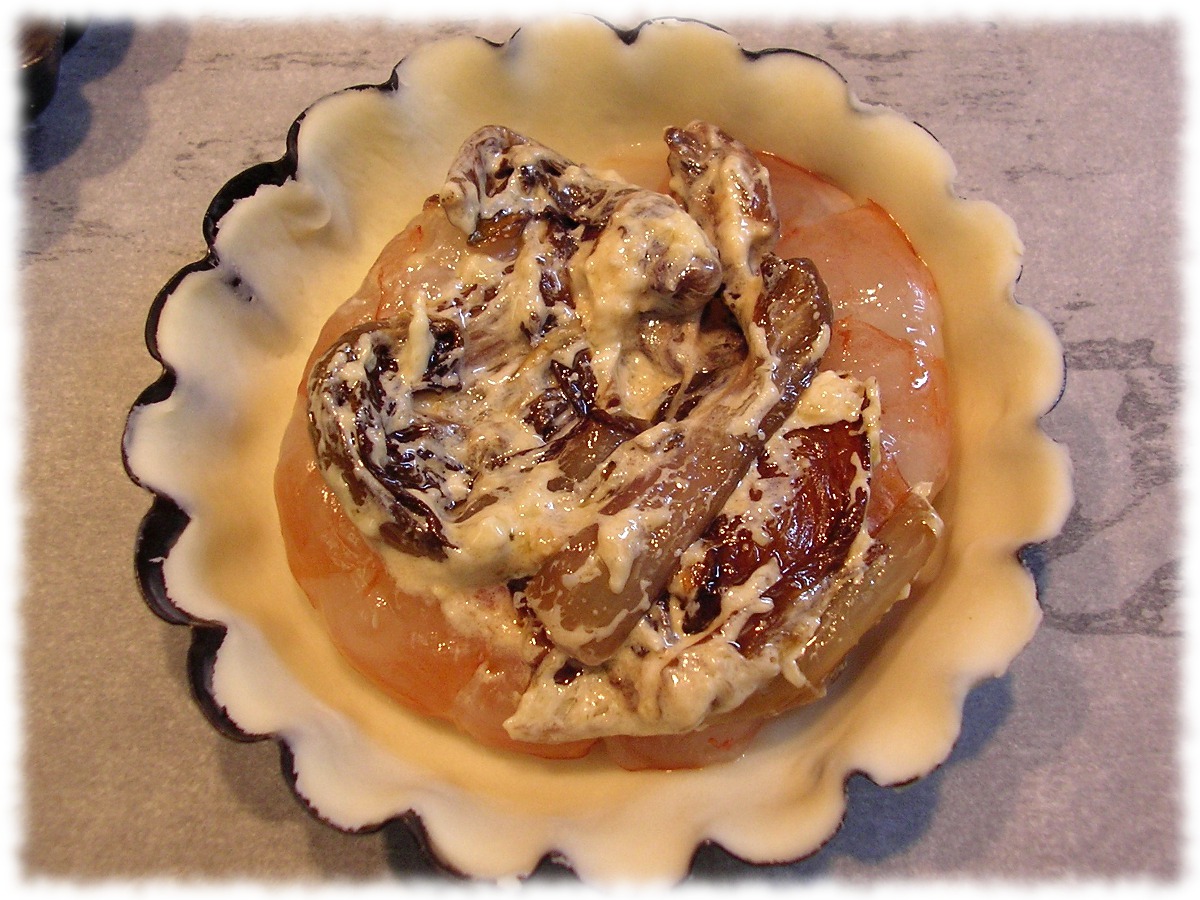In una terrina mettere farina, burro, un pizzico di sale, 2 cucchiai di vino, 1 uovo, 1 tuorlo, 1 cucchiaio di olio ed impastare velocemente il tutto. Lasciare riposare il composto in frigo per 20 minuti. Lavare il radicchio e tagliarlo a fettine sottili, infine rosolarlo in padella con 2 cucchiai di olio d’oliva, prezzemolo tritato, sale e pepe. Dopo pochissimi minuti di cottura sfumare con 1 cucchiaio di vino. Lasciarlo evaporare e aggiungere la panna. Mescolare e lasciare addensare. Infine aggiungere un uovo, togliere dal fuoco e mescolare. Prendere la pasta briseè e lavorarla con un mattarello portandola allo spessore di 1-2 cm. Imbrurrare e infarinare delle piccole teglie da una porzione e stendervi la pasta, versare il radicchio e qualche coda di gambero. Infornare a 170° per 25 minuti. Servire tiepide.