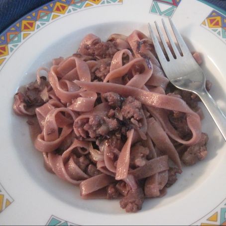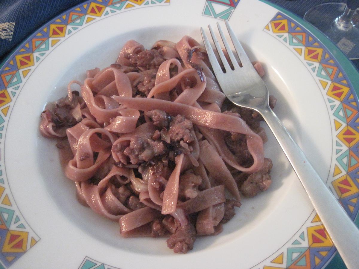 In una padella antiaderente scaldare un filo d’olio e aggiungere la salsiccia sbriciolata, il sale e il pepe. Rosolare la salsiccia per 5 minuti. Aggiungere il radicchio lavato e tagliato a striscioline e lasciar cuocere per altri 5 minuti. Poco prima di scolare le tagliatelle versare nella padella un mestolo di acqua di cottura. Scolare le tagliatelle e condirle direttamente nella padella a fuoco lento, unendo il burro, il parmigiano e il prezzemolo. Amalgamare bene il tutto.