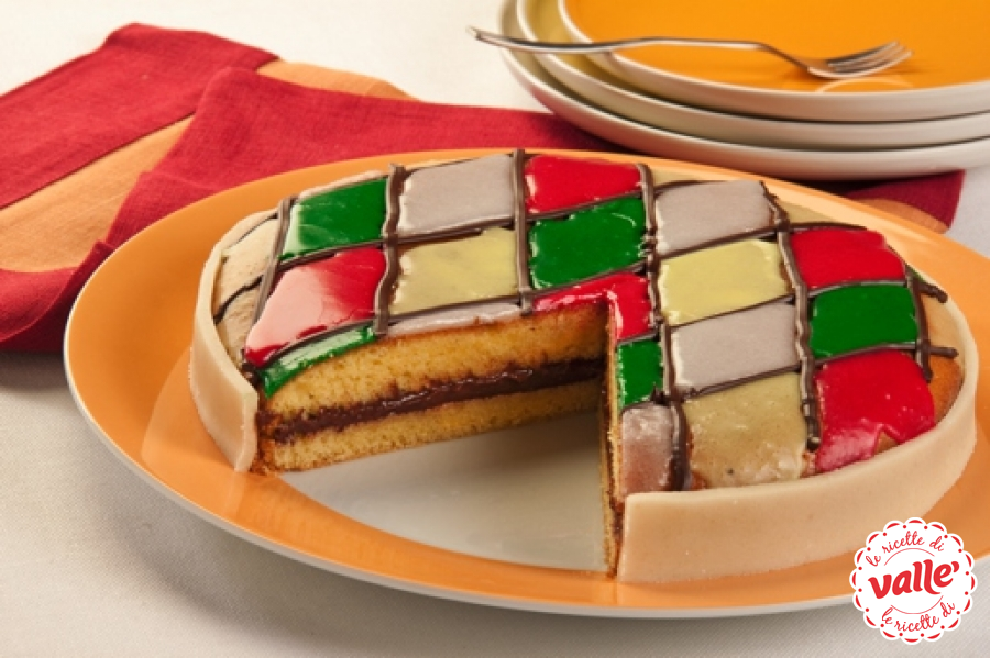 Nel frattempo fondi a bagnomaria il cioccolato e, con l’aiuto di un cono di carta forno o di una siringa, fai una griglia sulla superficie della torta che la divida in rombi pi lascia solidificare. Nel frattempo metti qualche cucchiaio di zucchero a velo in diverse ciotoline (una per ogni colore che hai deciso di usare) e aggiungi il colorante, mescola con cura fino ad ottenere un composto fluido ma non troppo liquido, altrimenti la glassa tenderà a “scivolare”; preparane anche una bianca, utilizzando qualche goccia d’acqua. “Colora” l’interno dei rombi con le glasse colorate e lascia asciugare bene prima di servire.