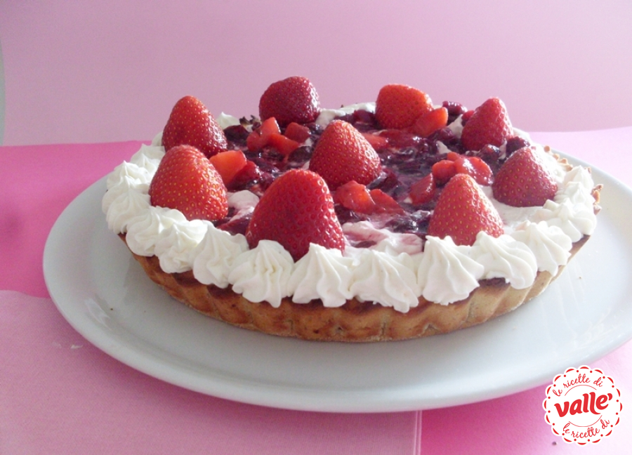 Preparare la frolla: setacciare le farine insieme allo zucchero, aggiungere la margarina ammorbidita e aggiungere le uova, lavorare l’impasto per formare un panetto e mettere in frigo a riposare per 2 ore. Preparare la crema al cioccolato bianco: scaldare 200 ml di panna ed unire lontano dal fuoco il cioccolato bianco tritato, mescolare e lasciare intiepidire. Una volta che è quasi freddo aggiungere la restante panna montata.