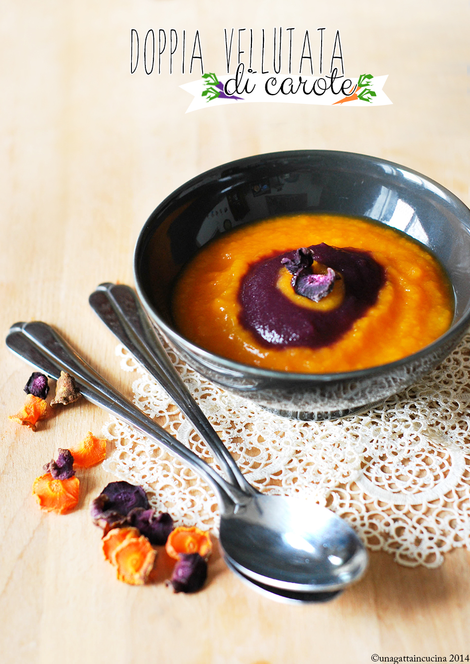 Aggiungete un po' di latte, mescolate e servite alternando i colori e guarnendo con le chips di carote e un filo d'olio.