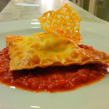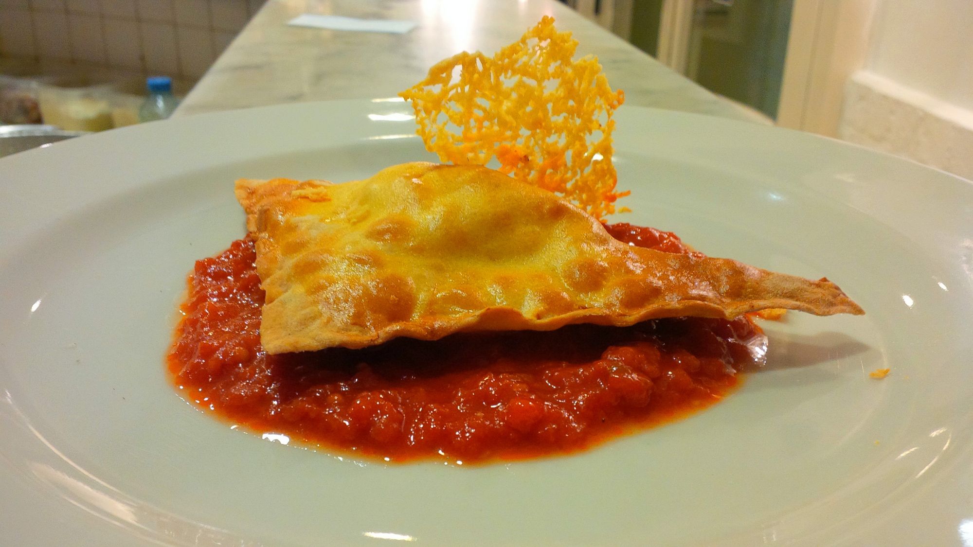 Per servire: versare la passata di pomodoro sul piatto e posizionare sopra i fiadoni.