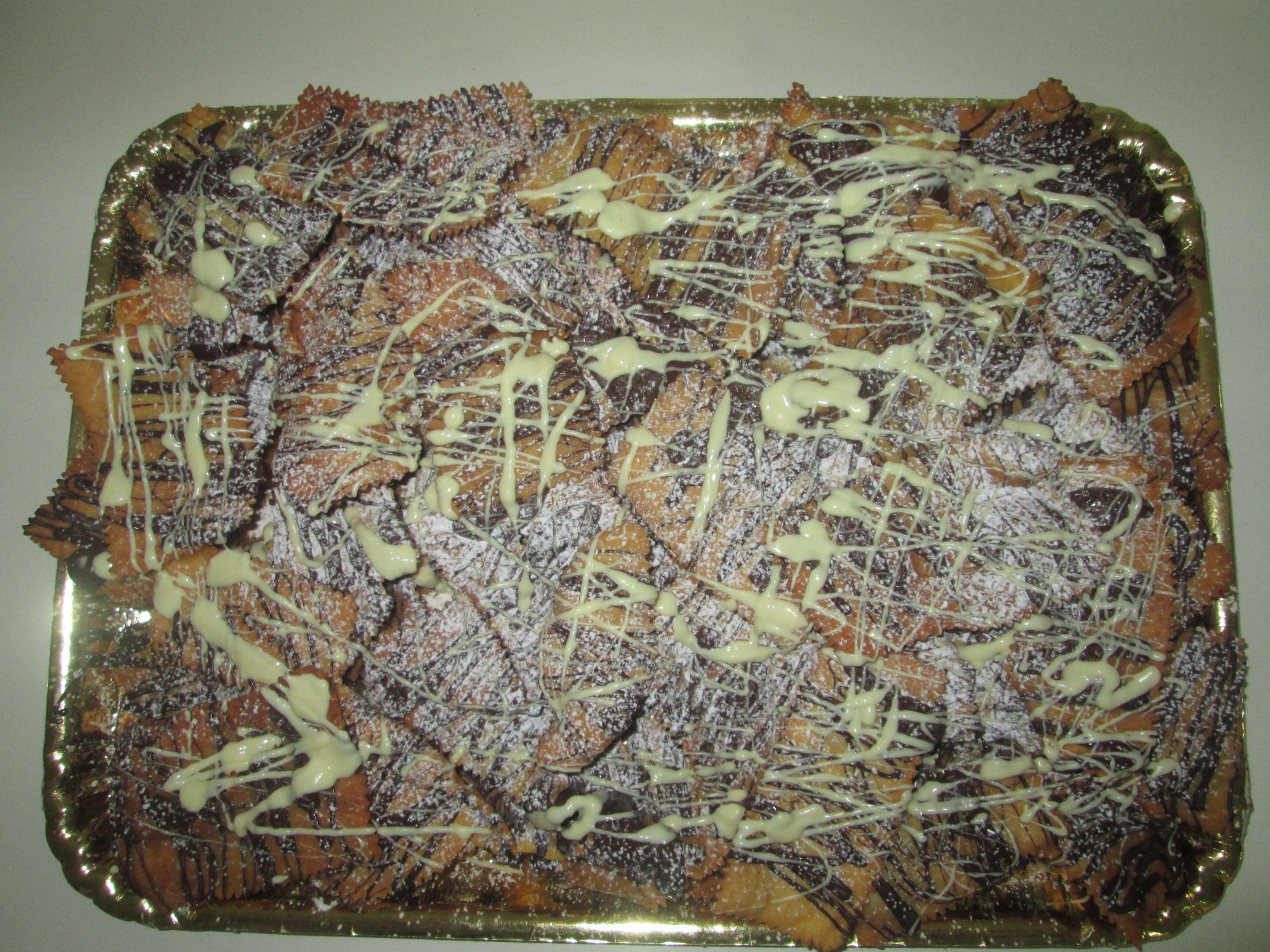 Dividere l impasto in 4 panetti , stendere ogni panetto o con il matterello o con la macchinetta in una sfoglia sottile , con una rotellina ritagliare delle strisce di uguale misura , bucherellare con la forchetta ogni strisciolina , friggerle in olio con temperatura giusta fino a doratura , scolarle , metterle su carta assorbente .