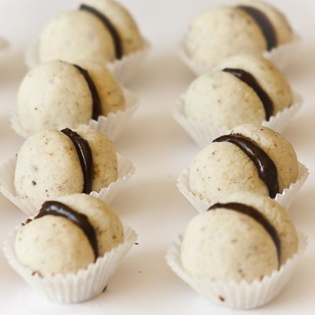 Lasciate riposare in frigo per 20 minuti. Formare delle piccole palline e disporle, distanziate, sulla carta da forno. Infornare a 160° per 45 minuti circa, finché non risulteranno coloriti.