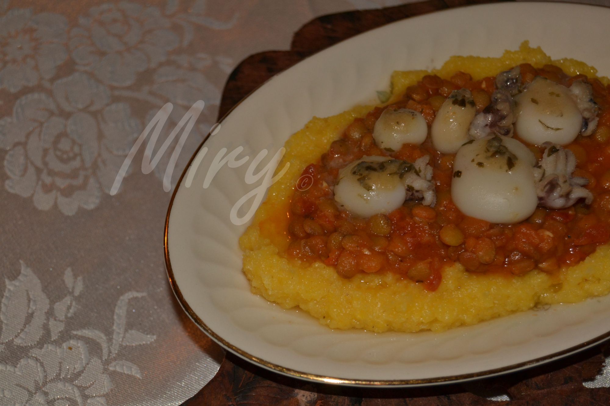 Comporre il piatto: nel fondo qualche cucchiaiata di polenta, sopra le lenticchie in umido e i moscardini con il loro sughino. Servire caldo.