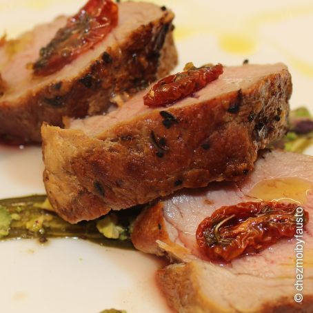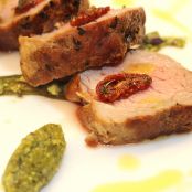 - 2 filetti di maiale interi, un pugno di semi di finocchietto selvatico, sale affumicato q. b., 1 tazzina di brandy, 20 pomodorini confit, 2 cucchiaini di pasta di pistacchio di Bronte, 3 cucchiai di pesto di pistacchi denso, 1 cucchiaio di granella di pistacchi grossolana, olio d'oliva q. b. olio e. v. o.