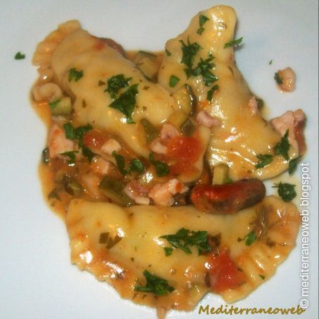 Laviamo bene le cozze ed asportiamo il filo, mettiamole in una pentola con un quarto di bicchiere di vino bianco e a fiamma vivace le facciamo aprire, le sgusciamo e teniamo da parte il liquido filtrato con un tovagliolo di cotone per la cottura. Laviamo il totano e lo priviamo delle viscere , gli occhi e il becco sotto i tentacoli, lo tagliamo piccolissimo e teniamo pure da parte. Grattugiamo i pomodorini in un piattino, e tritiamo pure dell'altro prezzemolo che useremo alla fine per guarnire il piatto. Adesso in una padella salta pasta con un giro di olio di oliva facciamo rosolare il cipollotto e i due spicchi di aglio tritati finissimi, aggiungiamo quindi il totano e a fiamma vivace facciamo sfumare con mezzo bicchiere di vino bianco, riabbassiamo la fiamma ed aggiungiamo le cozze sgusciate e un minuto dopo i pomodorini grattugiati, facciamo prendere il bollore ed aggiungiamo metà del liquido delle cozze, appena riprende il bollore versiamo i nostri ravioli e mescolando spesso facciamo attenzione che non si asciughi mai il liquido, possiamo aggiungere ancora un quarto di bicchiere di vino bianco e un quarto di bicchiere di acqua, questo ci consentirà di prolungare la cottura per almeno 10 minuti, infine aggiungiamo il restante liquido delle cozze, a questo punto il sughetto sarà ridotto ad una cremina, quindi facciamo saltare e lasciamo asciugare il liquido in eccesso, adesso aggiungiamo il prezzemolo tritato, servire nei piatti di portata e.....buon appetito.