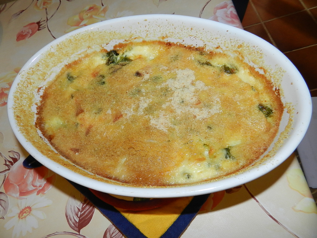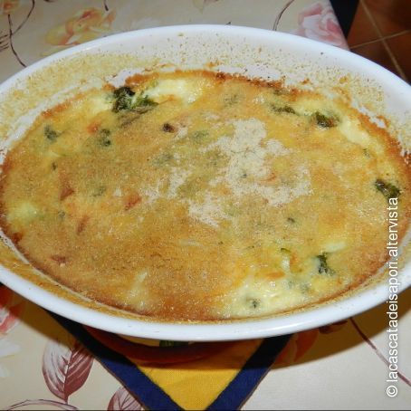 Amalgamate e mettete il composto in una pirofila o teglia di circa 22 cm di diametro, imburrata e spolverata di pangrattato.