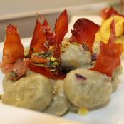 Impiattare aggiungendo la granella di pistacchi sugli gnocchi "verdi", i pistilli di zafferano su quelli gialli e le strisce di speck tostato, come fossero delle fiamme, filo d'olio e. v. o. e .... buon appetito.