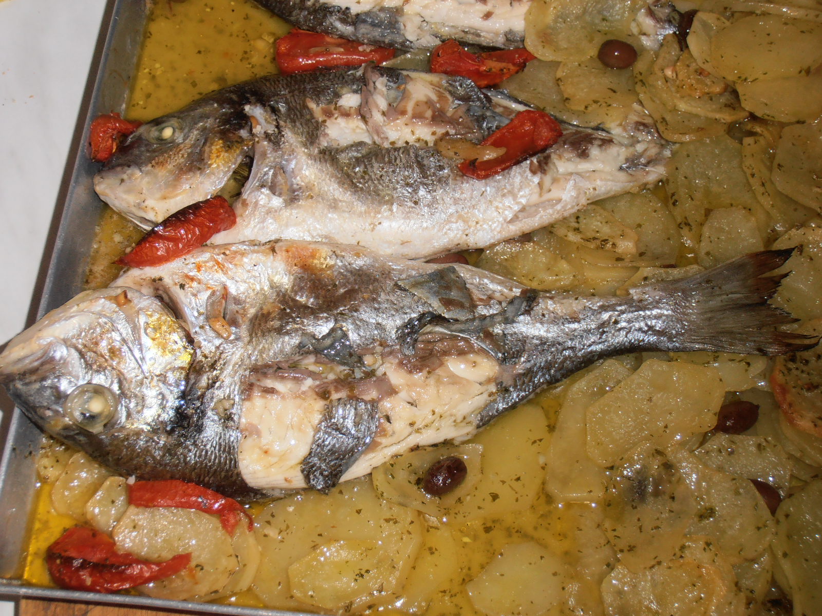Dopo averlo pulito, sistemare il pesce sopra le patate e bagnarlo con olio e vino bianco. Aggiungere prezzemolo e pomodorini.
