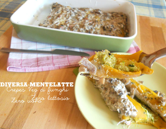 3. Prendere le crepes, inserire nel centro 1 cucchiaino della salsa verde (o di qualsiasi altro tipo di condimento voi scegliate!) e arrotolarla (tipo cannellone!). Fare così con tutte le crepes e sistemarle in una pirofila da forno. Quando saranno tutte sistemate versarvi sopra il sughetto a base di funghi e panna di soia. Livellare bene la superficie e cospargere in ultimo con una grattugiata abbondante di pecorino sardo.