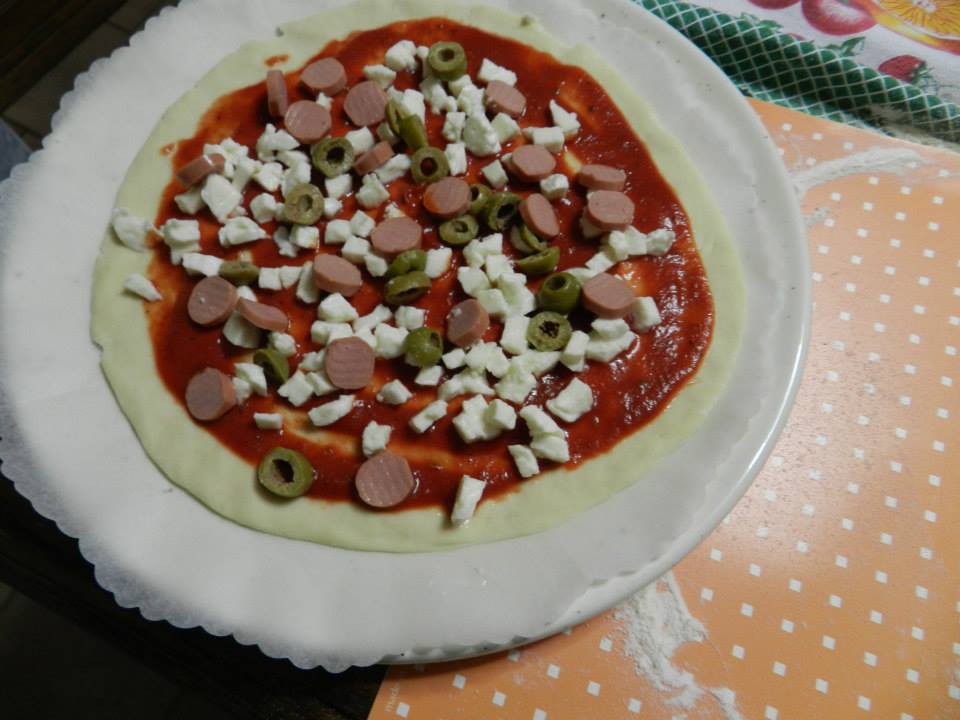 Fatto ciò prendete un piccolo mestolo di condimento al pomodoro (o metà di un mestolo normale), e dal centro fate un movimento rotatorio, fino ai bordi.