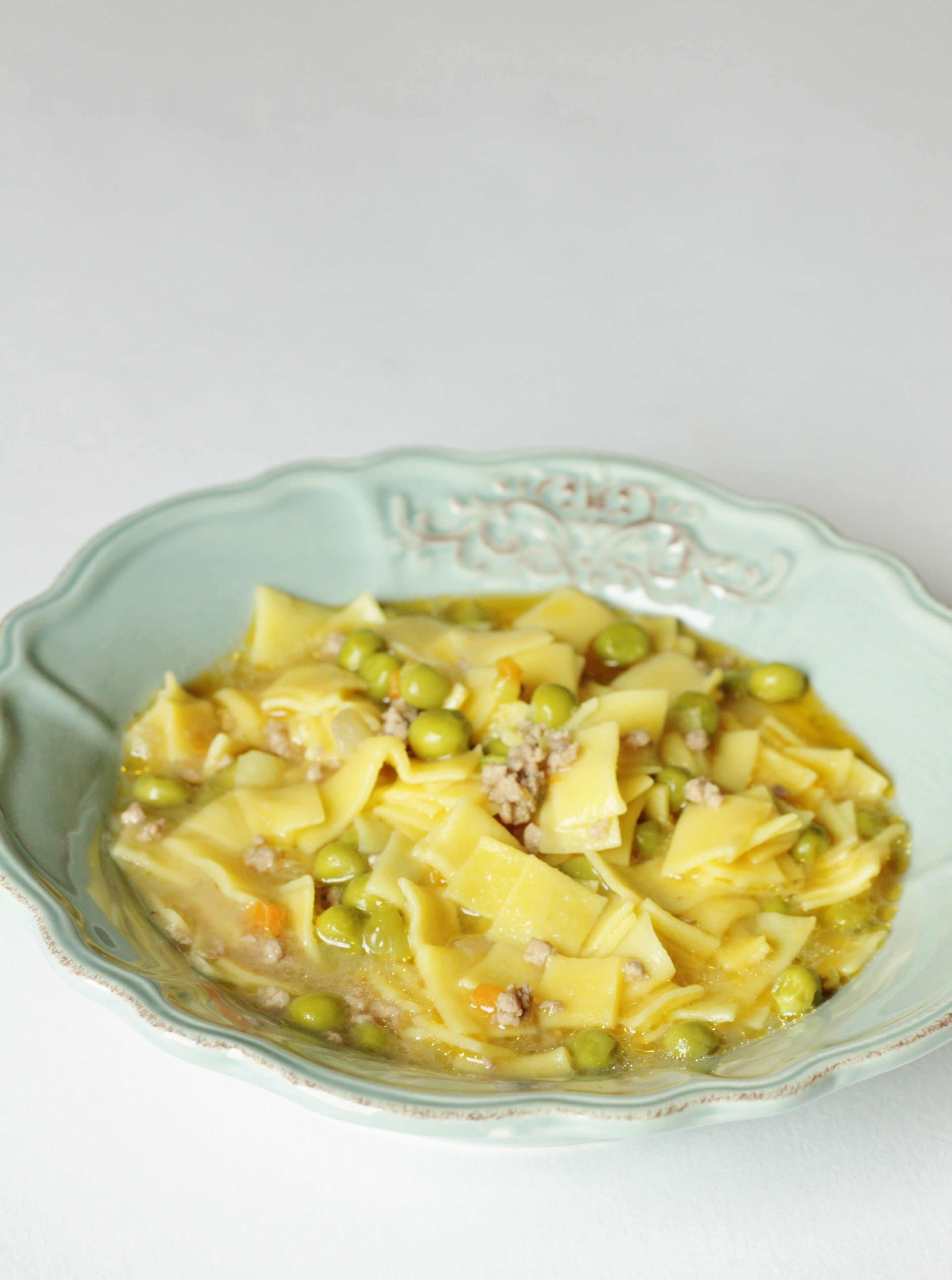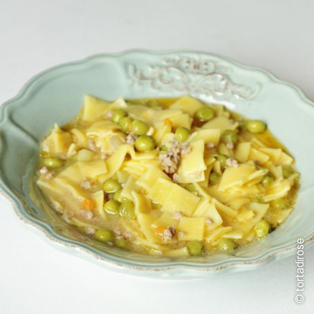 Soffriggere le verdure nell'olio, unire la carne tritata e farla dorare, aggiungere i piselli e il pomodoro. Coprire con acqua e cuocere circa 10 minuti. Versare la pasta all'uovo, aggiustare di sale e pepe. Terminare la cottura. Servire calda con parmigiano grattugiato.