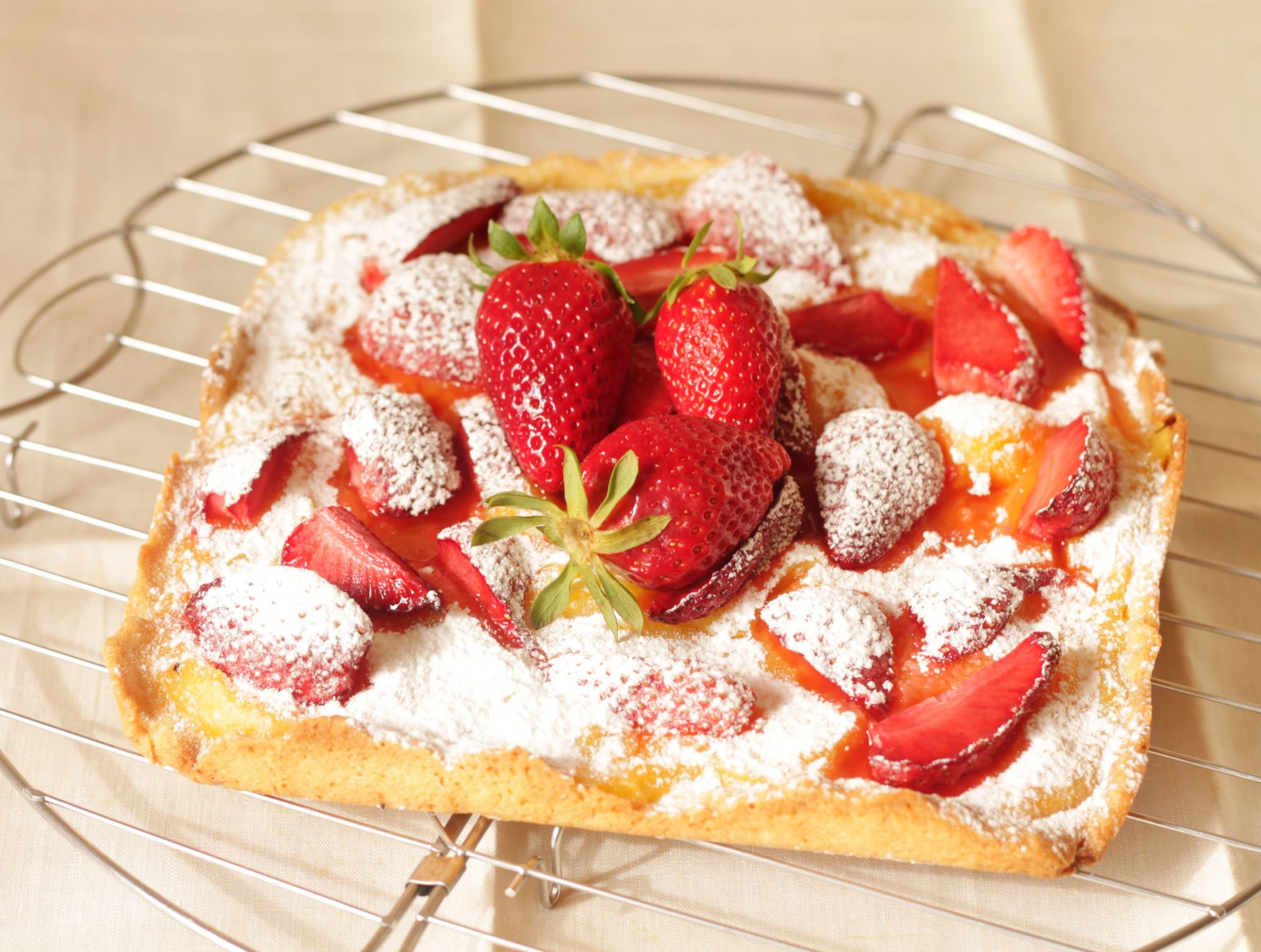 Preparare la crema al limone: in una terrina lavorare con una frusta elettrica le uova, lo zucchero, la farina. Unire la scorza grattugiata e il succo di limone, il latte e una presa di sale, mescolando fino ad ottenere una crema liscia e omogenea. Abbassare la temperatura del forno a 160°. Versare la crema al limone sulla base cotta e ancora tiepida, cospargere la crema con le fragole e infornare di nuovo per altri 20-25 minuti, o finché la crema comincerà a solidificarsi. Sfornare il dolce e lasciarlo intiepidire sulla placca prima di trasferirlo su una gratella a raffreddare. Quando sarà freddo sformarlo, spolverizzare con zucchero a velo e decorare con le fragole intere.