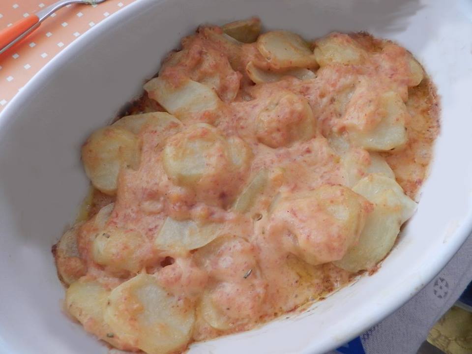 Tagliate le patate a fette, sistematele in una pirofila imburrata e copritele con la crema al prosciutto.