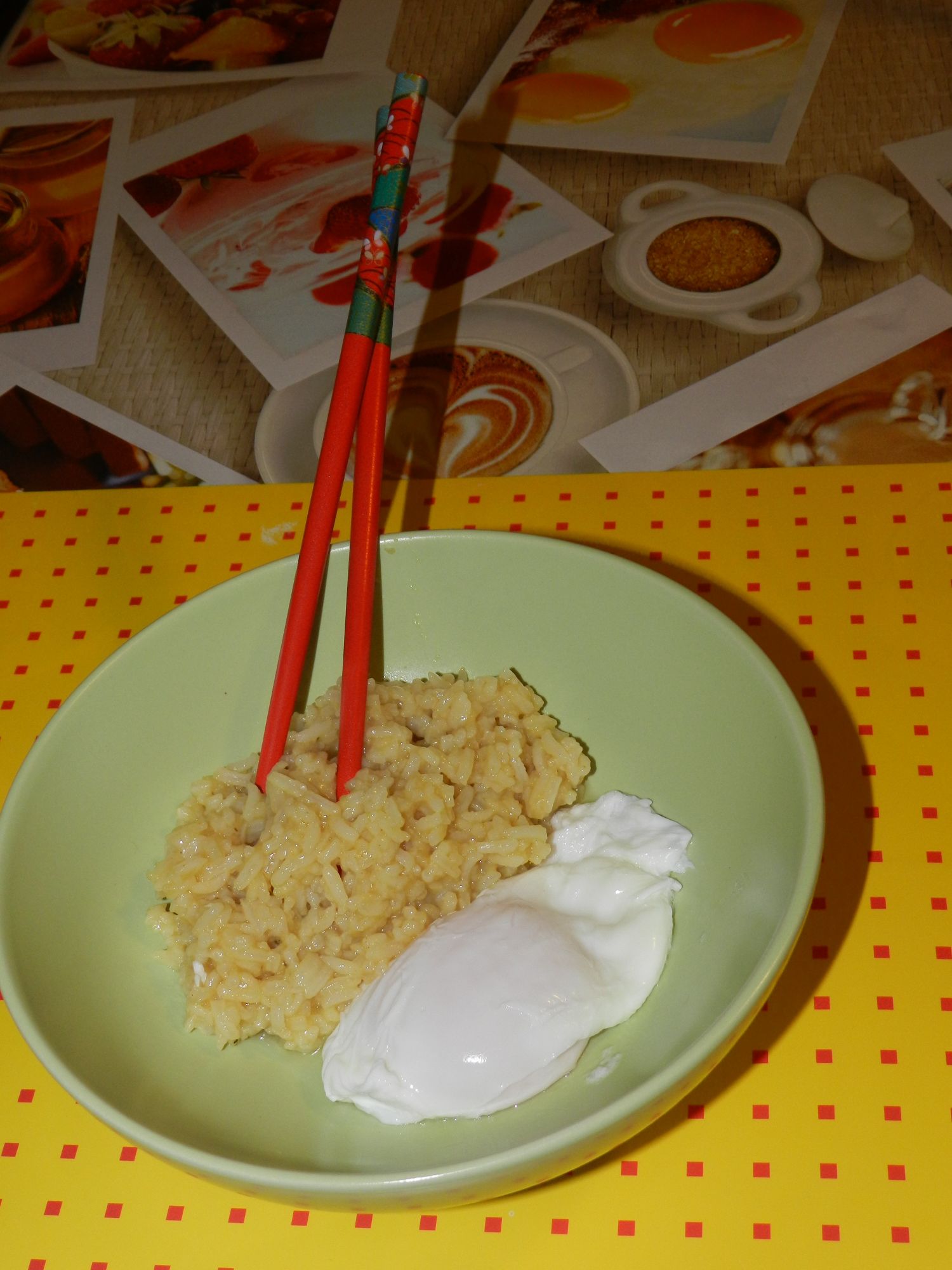 Riso per sushi preparato con il curry e servito insieme all’uovo in camicia!