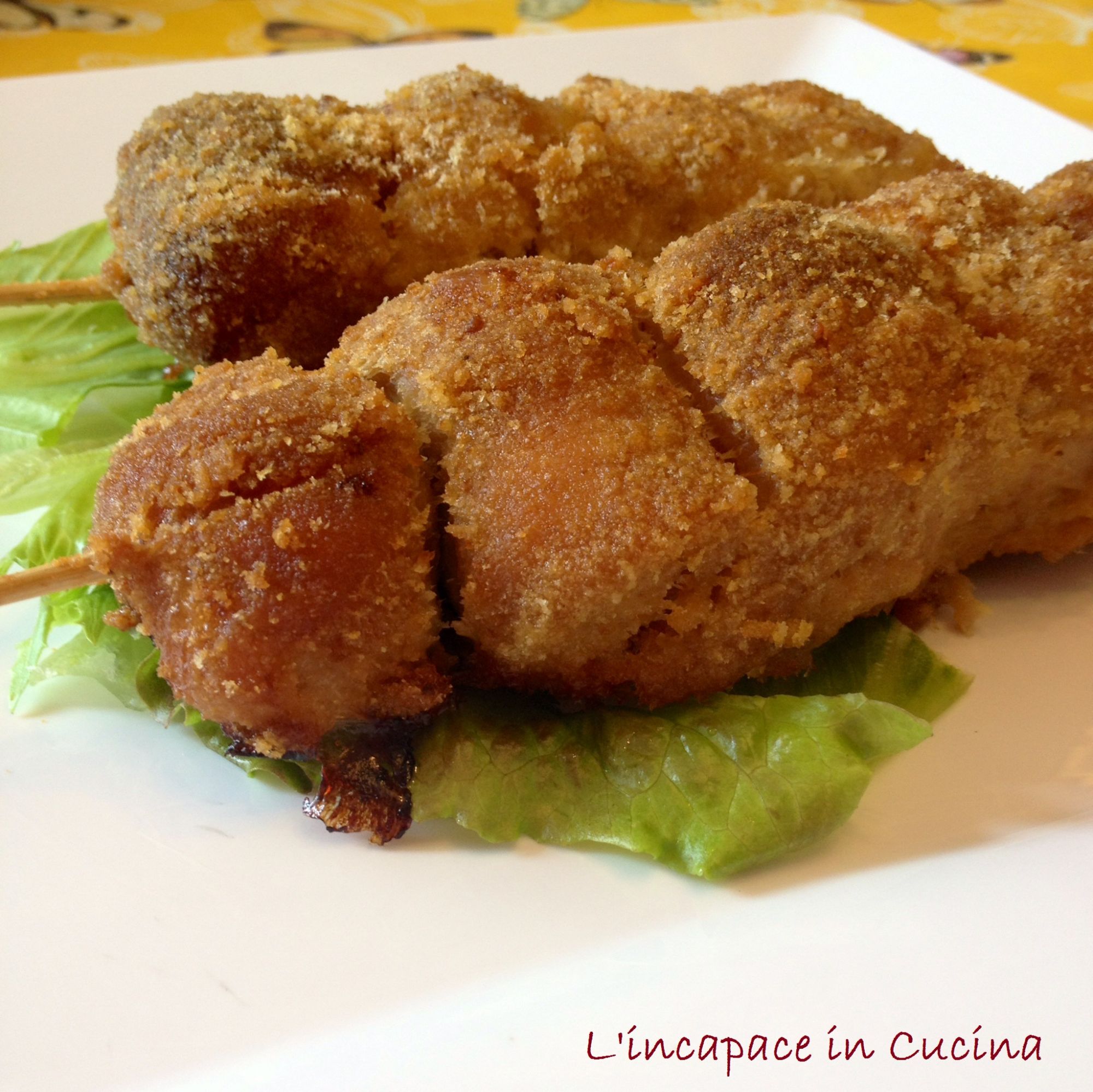 * Infilzate delicatemente le crocchette in uno stuzzicadenti lungo mettendone 4 per ogni spiedino.
