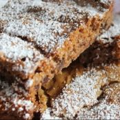 Versate il composto così ottenuto in una teglia di alluminio ed infornate a 180° per 40 minuti. Spegnete il forno, lasciatelo dentro ancora 10 minuti e poi fate raffreddare. Tagliate in quadrotti e spolverizzate con zucchero a velo.
