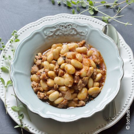Tritare la cipolla, la salsiccia e la pancetta a dadini e far soffriggere tutto in una padella con poco olio. Unire i fagioli e la salsa di pomodoro, cuocere per circa 10 minuti a fuoco basso. Condire con maggiorana, sale e pepe.