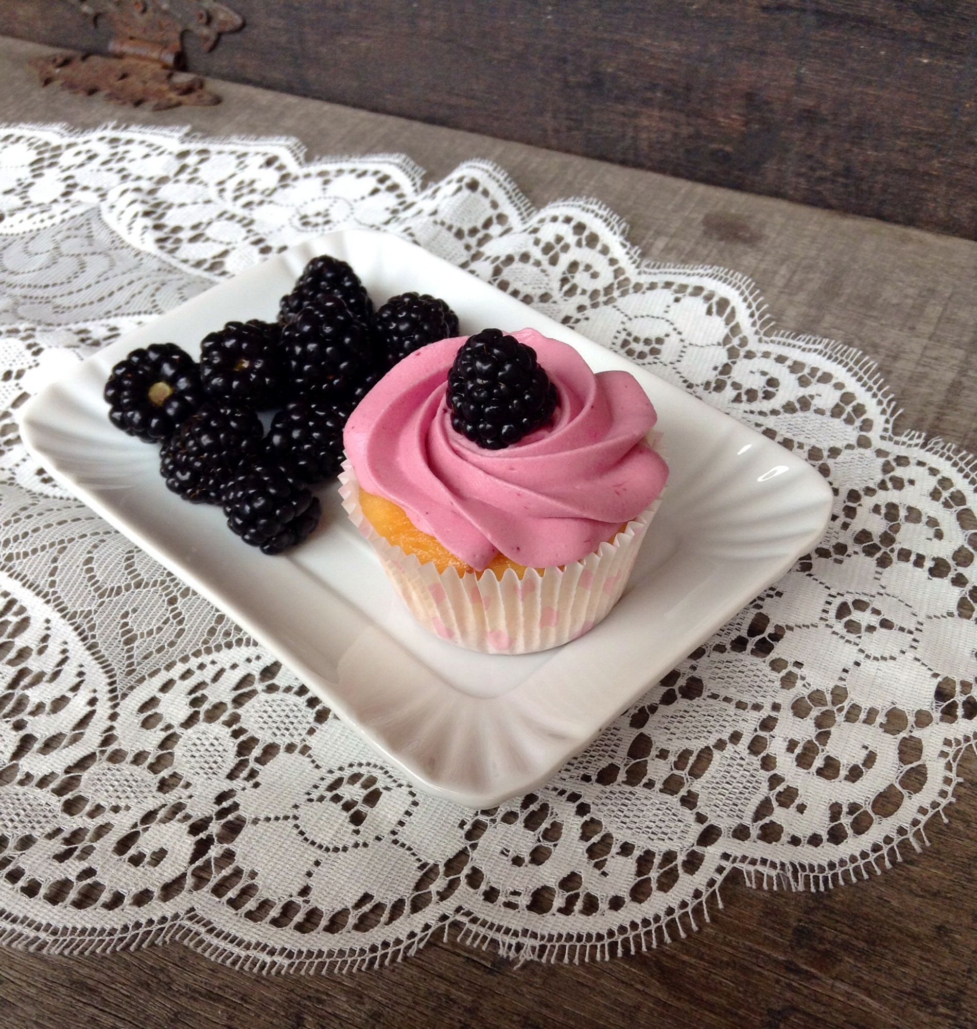 Cupcakes estivi e rinfescanti, con una base di yogurt greco con 0% di grassi, un buttercream alle more e come decorazione una mora fresca.