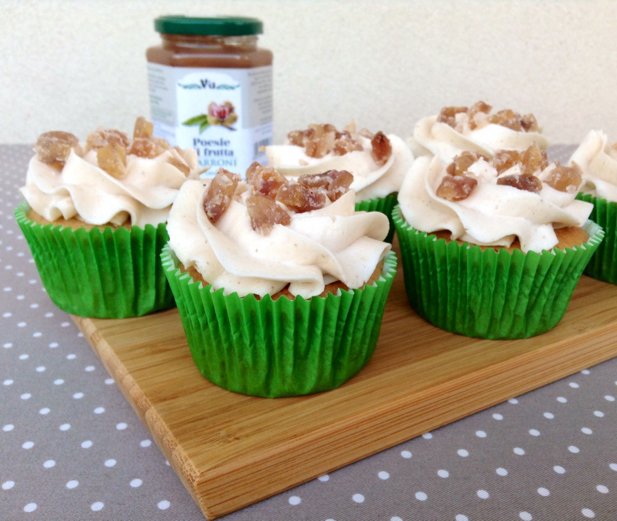 Cupcakes ai marroni, con la base e il buttercream alla crema di marroni e decorati con pezzetti di marron glacé.