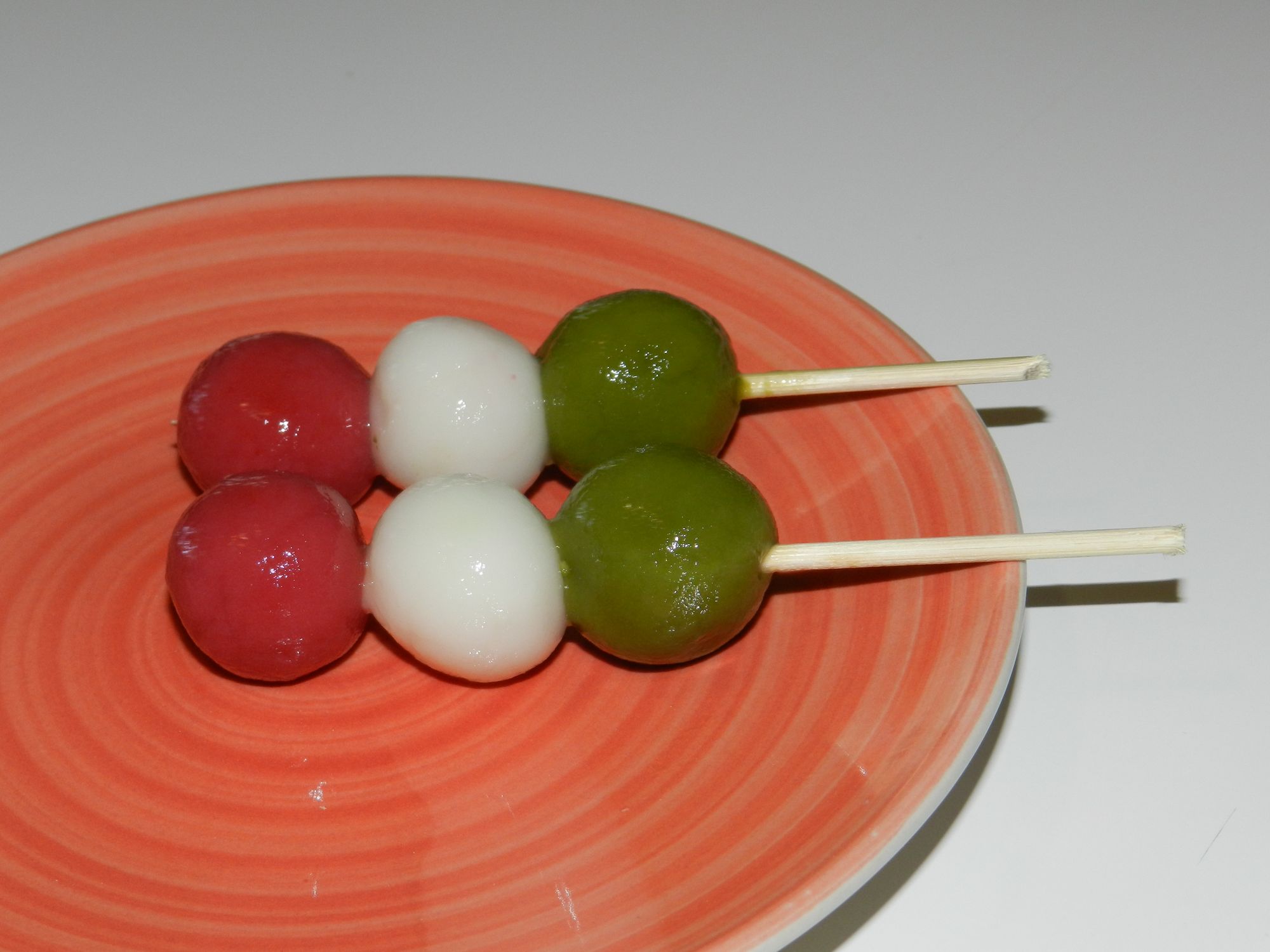 Infilate un dango di ogni colore su uno spiedino come nella foto.