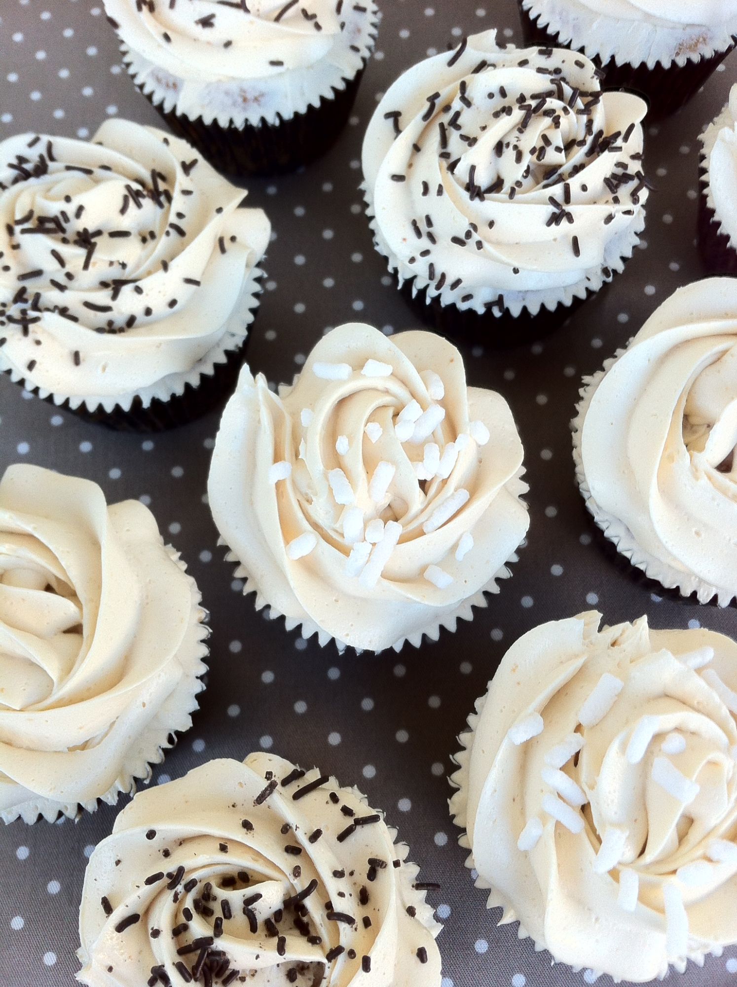 Versare il buttercream in una sac à poche e decorare i cupcakes. Ho usato una bocchetta Wilton numero 2D. Prima con una spatola ho coperto il cupcake con uno strato sottile di buttercream e poi con la sac à poche ho fatto la decorazione partendo dal centro e girando attorno per creare una sorta di fiore. Come tocco finale decorare con granella di zucchero o codette di ciocolatto.