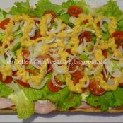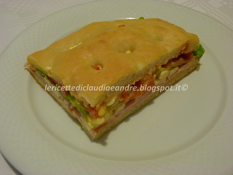 Fare raffreddare e dividere la focaccia in due parti. Condirla con le varie salse, il prosciutto ,la mozzarella, l'insalata , i pomodorini, la cipolla e rivestire con l'altra metà della focaccia. Tagliare a pezzi e mangiare di gusto!!!