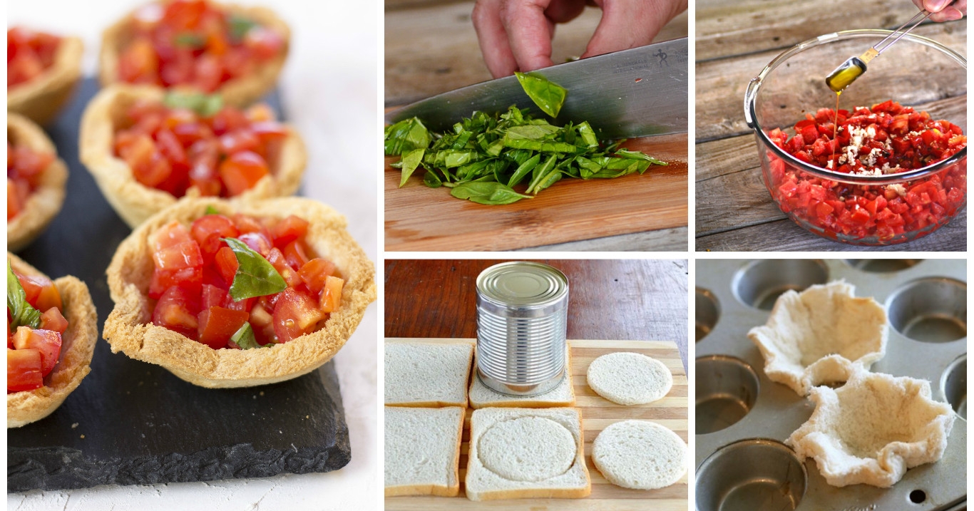 Lavare i pomodori e tagliarli a pezzetti. Condire con l'olio, l'aglio e le foglie di basilico tritati. Lasciare insaporire. Scaldare il forno a 180° C. Spennellare il pancarrè su entrambi i lati con un leggero strato di olio, spolverizzare con poco sale e stendere le fette con un matterello per appiattirle. Con un tagliabiscotti del diametro di 9 cm ritagliare 6 dischi e schiacciarli dentro gli stampini da muffin, per foderarli.