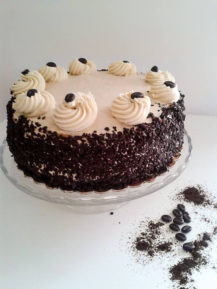 Tagliare la base in 3 dischi, porre il primo disco all'interno di un anello per torte, con l'aiuto di una saccapoche versarvi uno strato di crema e il disco di riso, procedere con il secondo e il terzo strato altrenandovi con la sola crema, riporre in frigo per un paio d'ore. Tolto l'anello rivestire con la restante crema tutta a torta e riporre nuovamente in frigo per un paio d'ore. Trascorso il tempo necessario decorare con ciuffi di cremoso e chicchi di caffè.