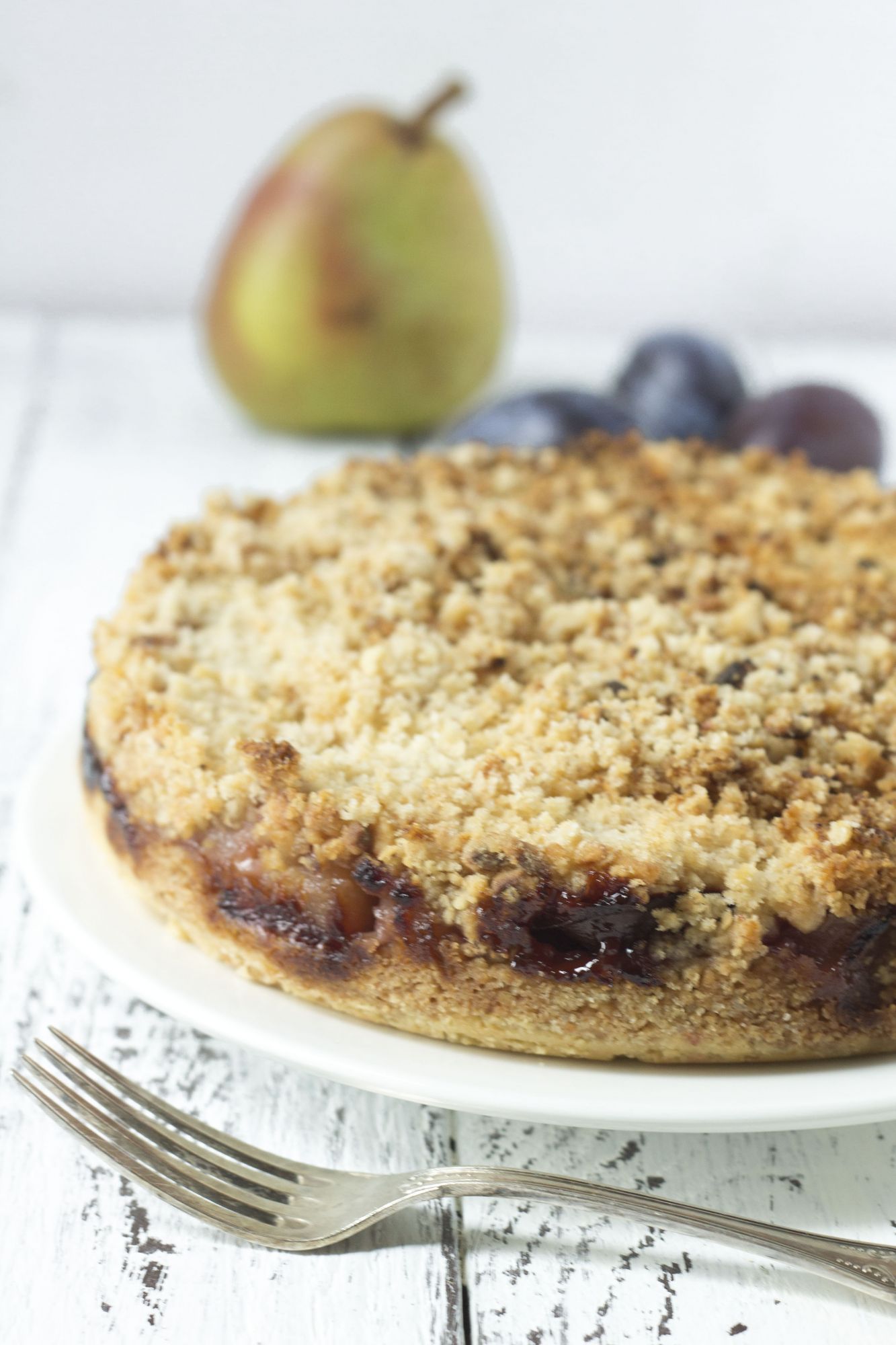 Crumble di prugne e pere con salsa al vino rosso e balsamico