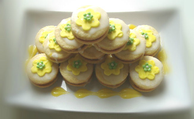 Prendere un biscotto, versare un cucchiaino di lemon curd e ricoprirlo con un altro biscotto.