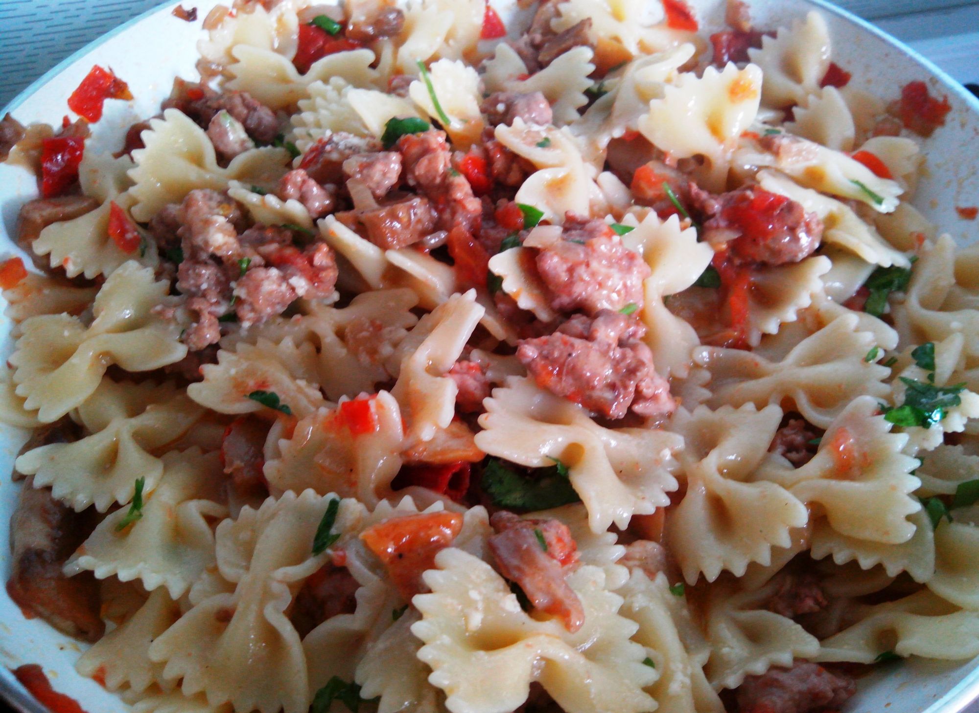 Schiacciate uno spicchio di aglio e mettetelo in un tegame a rosolare con olio, ½ cipolla tritata ed il peperoncino a pezzetti a fuoco dolce, non appena il tutto è dorato, eliminare l’aglio e aggiungere la salsiccia, frantumandola con le mani, quando è ben rosolata, sfumare con il vino e lasciare evaporare; salare e pepare, aggiungere i funghi e i pomodorini tagliati in 4. Terminare la cottura con un poco di acqua di cottura della pasta che nel frattempo avremo fatto cuocere.