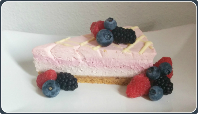Riprendere dal frigorifero la teglia con la base e fare il primo strato con la crema preparata con i mirtilli e livellare, far seguire il composto di more e infine quello di lamponi, sempre livellandoli.