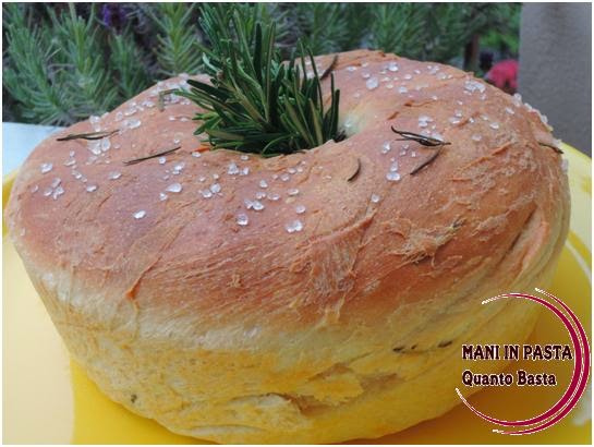 Una volta raggiunto il raddoppio, riprendere la palla lievitata e sgonfiarla, quindi metterla in uno stampo a ciambella e fare lievitare di nuovo per un paio d'ore. Ora spennellarla con olio extravergine, aghi di rosmarino, sale grosso e cuocere in forno già caldo a 200° per 30 minuti.