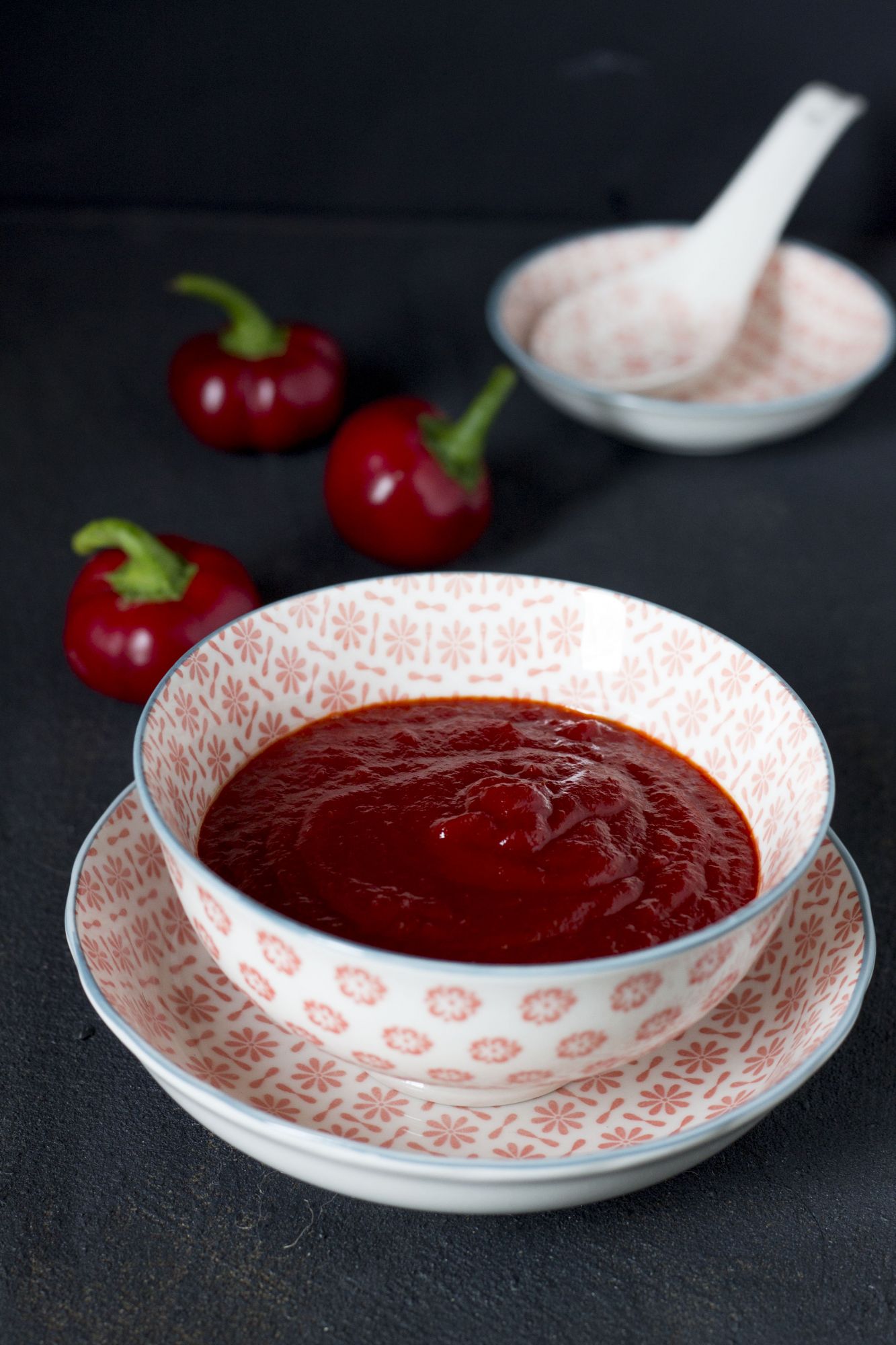 Lavare e tagliare i peperoni e i peperoncini, togliere loro il picciolo, i filamenti bianchi interni e i semi e tagliarli a pezzi. Mettere i due tipi di peperoni in una casseruola con lo zucchero, il sale e il vino, cuocere a fuoco minimo, coprendo la pentola con un coperchio, per circa un’ora. Togliere dal fuoco e frullare il composto. Rimettere la pentola sul fuoco e terminare la cottura fino ad ottenere una crema densa. Invasare in barattoli sterilizzati, chiudere il coperchio, capovolgere il barattolo e far raffreddare.