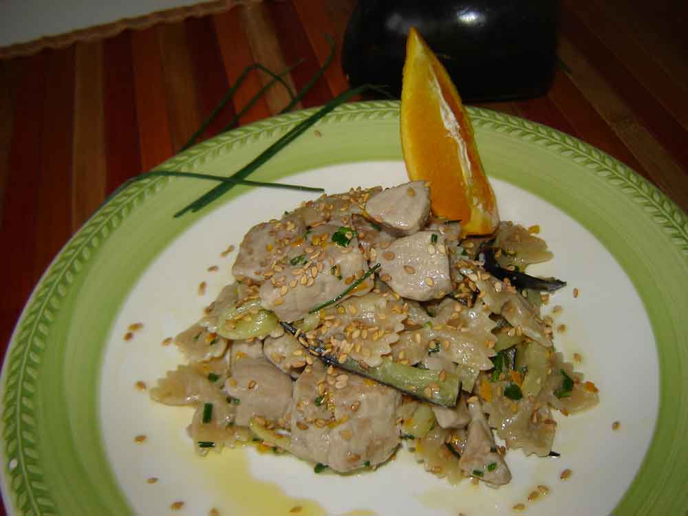 Ci sono le melanzane, il tonno, le arance e il sesamo. Una pasta squisita, velocissima da preparare e molto mediterranea.