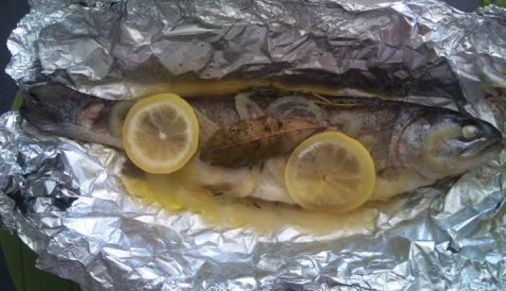 Tagliare due rettangoli di alluminio alimentare, adagiare su ognuno 2 fette di limone, adagiarvi sopra le trote.