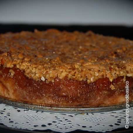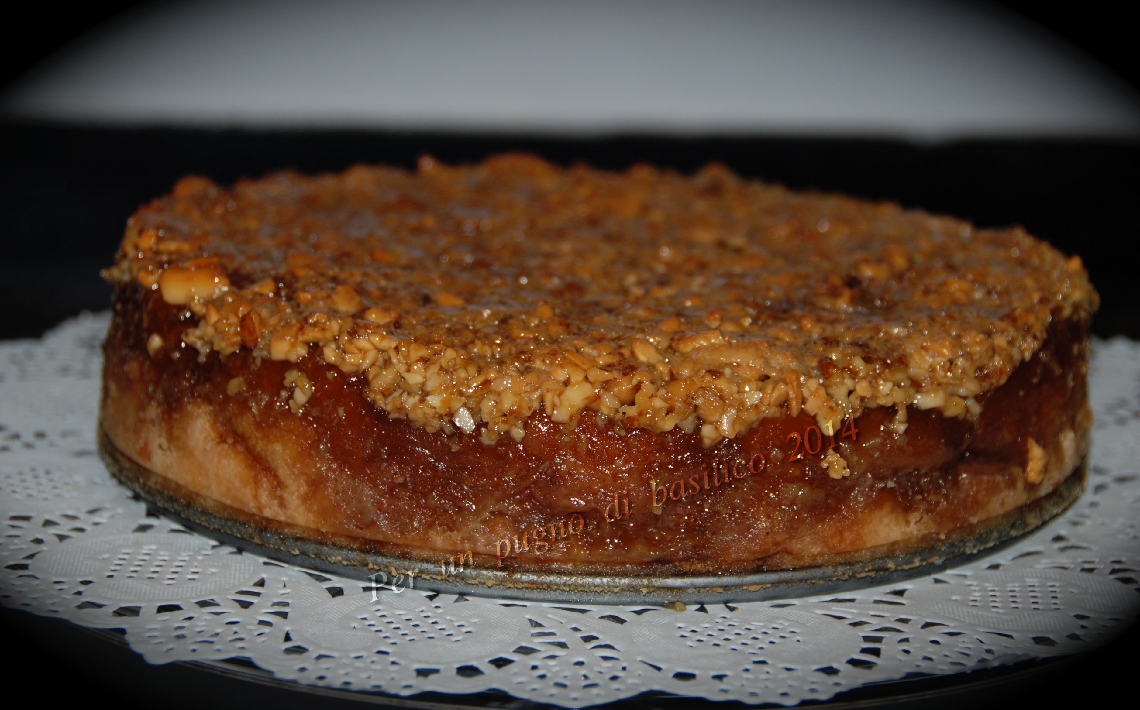 Mentre la torta e’ in forno preparate la copertura facendo sciogliere lo zucchero nel burro senza arrivare a bollore. Una volta sciolto completamente lo zucchero unite la frutta secca tritata non troppo finemente, aggiungete 2 cucchiai di acqua calda e continuate la cottura per alcuni minuti ( il composto sovra’ risultare semiliquido)