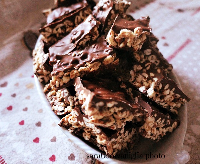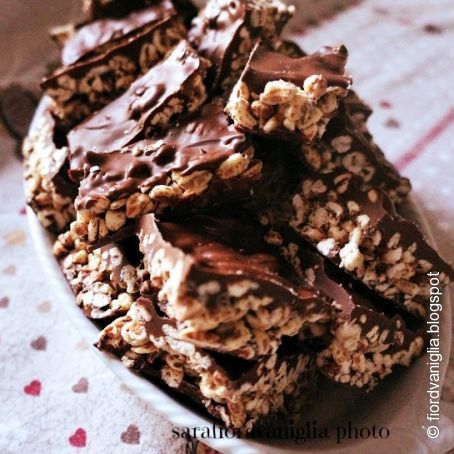 Sciogliete a bagnomaria il cioccolato bianco poi mescolatelo assieme al farro soffiato e tenete da parte. Sciogliete,sempre a bagnomaria, 100 g di cioccolato al latte con 50 g di fondente. Foderate con carta forno una teglia (io ne ho usata una quadrata di 30 cm di lato), versatevi il cioccolato al latte fuso, coprendo tutta la base della teglia. Ponetevi sopra il farro e con le mani stendetelo, appiattendolo bene per tutta la teglia in modo che risulti ben compatto. Ponete in frigo a solidificare per circa mezz'ora. Trascorso questo tempo sciogliete a bagnomaria il restante cioccolato e la crema alla nocciola. Riprendete la teglia dal frigo e versate sopra al farro il cioccolato appena sciolto, ricoprite bene tutto il farro e riponete in frigo finchè solidifica anche l'ultimo strato. Una volta pronto, togliete dal frigo, staccate la carta forno dalla base del dolce e tagliatelo a quadretti. Conservate in frigo fino al momento di servire.
