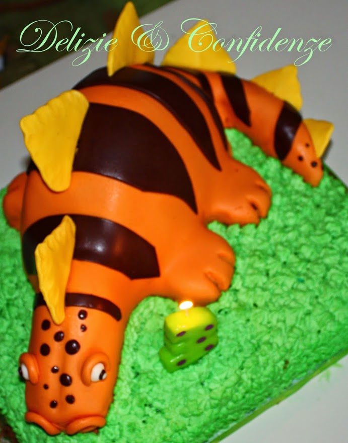 Torta a forma di dinosauro, ricoperta con cioccolato plastico e pasta di zucchero, su una base "moretta" risoperta di soffice prato verde...