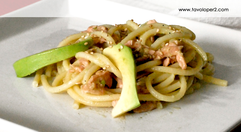 Scoliamo la pasta al dente, la saltiamo nella padella con il salmone e spegniamo. Fuori dal fuoco aggiungiamo la crema d’avocado e mescoliamo bene. Impiattiamo ed decoriamo con le fettine di avocado e se vi va una spolverata di sesamo.