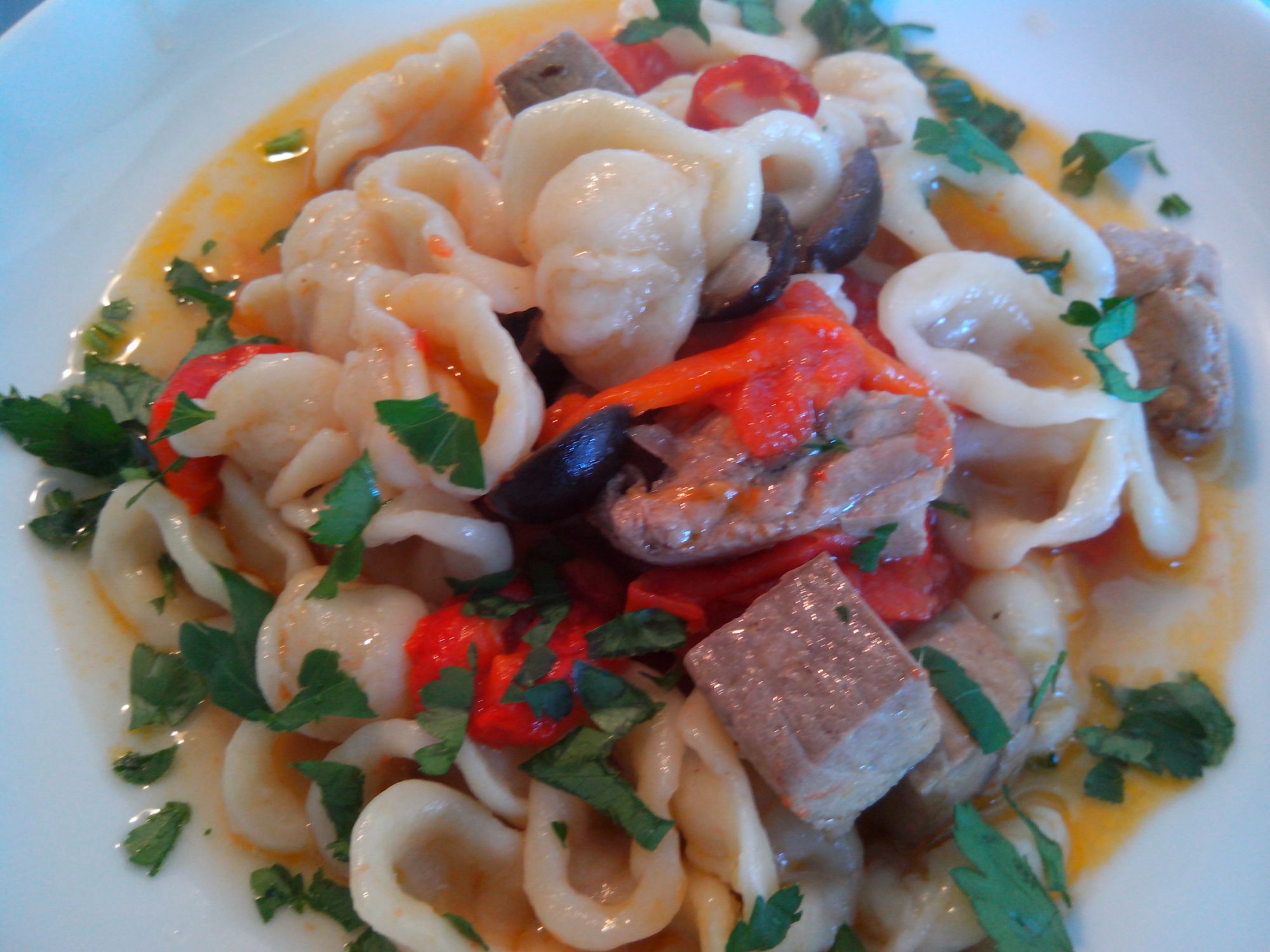 Al fondo della padella aggiungere il peperone a striscioline, le olive e i pomodorini a pezzetti, lasciare appassire, aggiustare di sale e pepe, quindi aggiungere il tonno e coprire con coperchio, tenendo a fuoco bassissimo, nel frattempo la pasta è cotta, scolarla e saltarla in padella con il tonno.