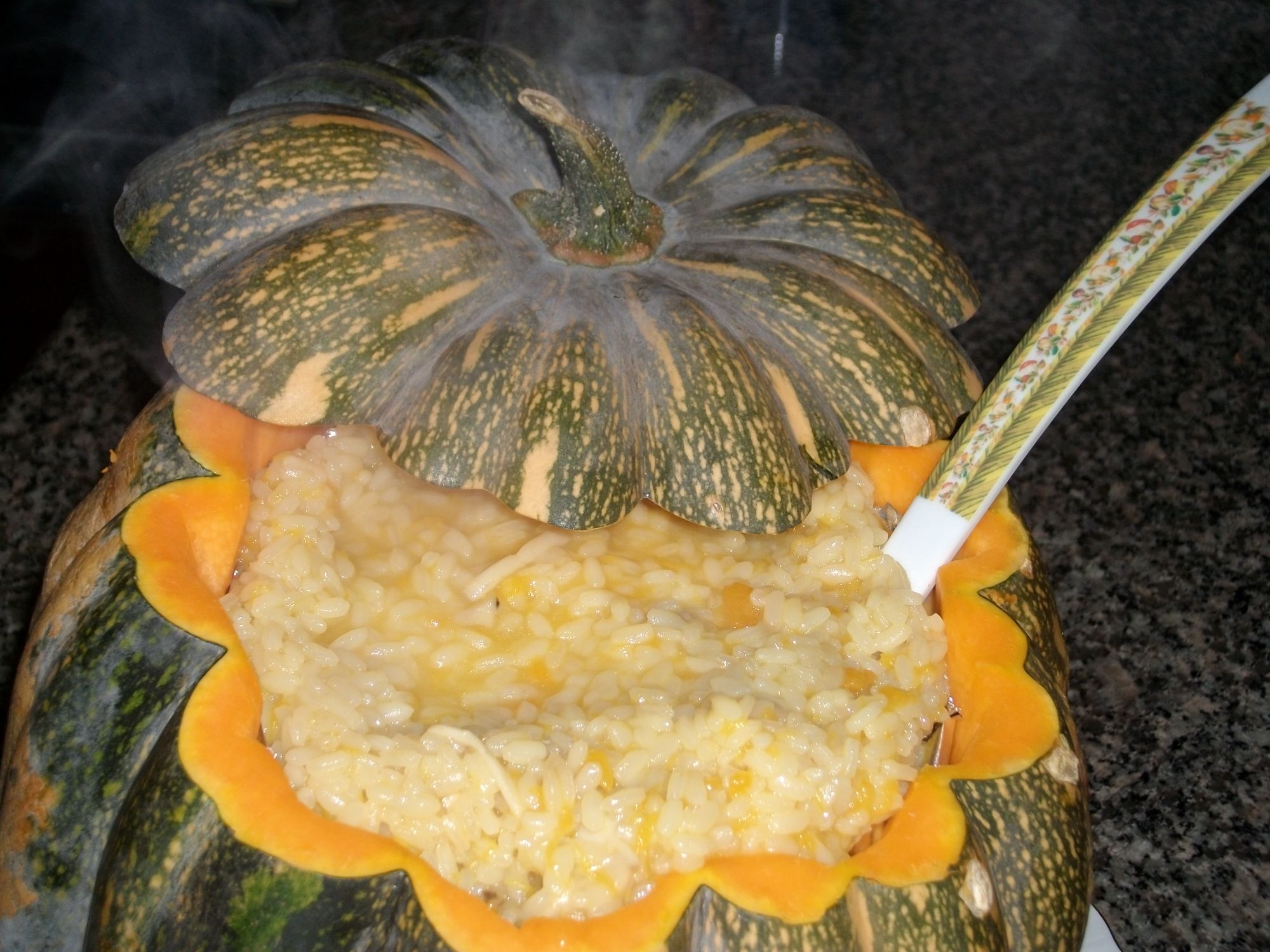 Per stupire gli ospiti svuotate una zucca di dimensioni non eccessive, versatevi all'interno il risotto e servite in tavola.