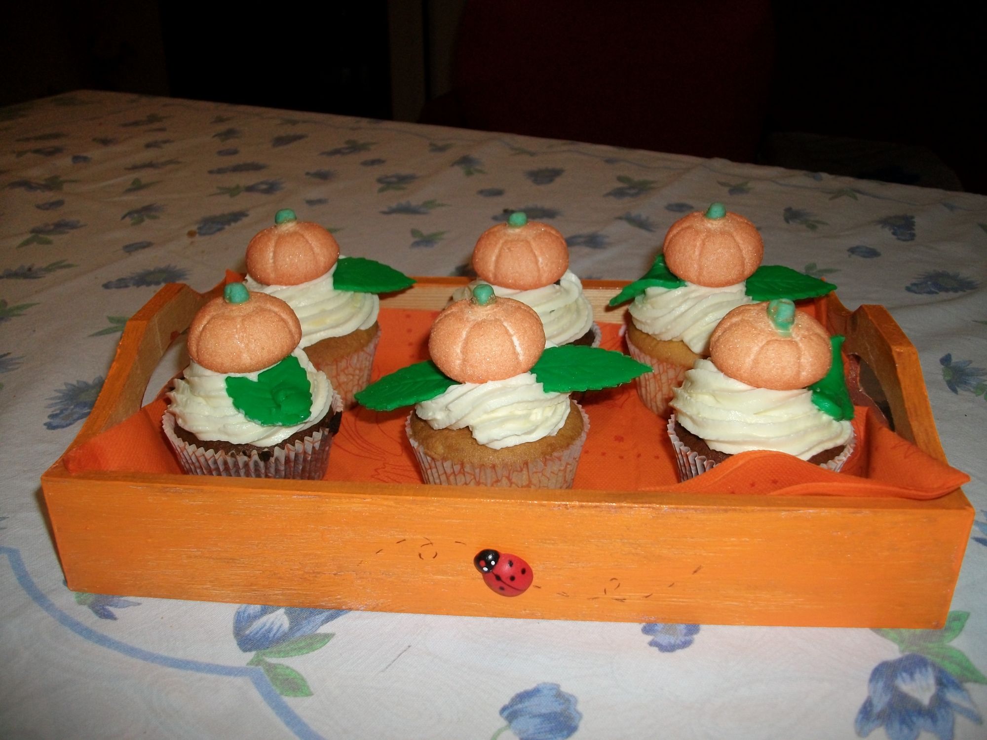 Su ogni cupcakes fate un giro di frosting e decorate con una zucchetta di mashmellow e una foglia o due di pasta di zucchero...e buon Halloween !!!