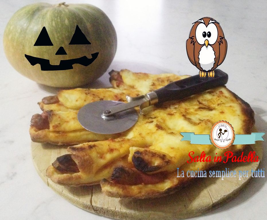 Per prima cosa preparate l’impasto per pizza e fatelo lievitare almeno 2 ore, poi dividete l’impasto in 4 bocce e fate lievitare nuovamente per altre 2 ore. Quando saranno pronti, condite la passata di pomodoro con il sale, origano, olio, pepe e amalgamate il tutto. Tagliate a cubetti piccoli la mozzarella e ricavate dai wurstel le dita, tagliandolo a metà, poi affettatelo in 3 parti dal lato lungo, in modo da mantenere la parte rotonda che sarà la parte finale dell’unghia della vostra mano, quando avrete ricavato le 10 dita, quello che avanza dai wurstel lo utilizzerete per condire il palmo della mano. Prendete una boccia e stendetela con le mani senza mattarello, se volete potete disegnare una sagoma della mano in cartone, ritagliate la mano aiutandovi con la rotella per pizza o un coltello. Stendete con le mani, le dita dell’impasto in modo da formare un solco dove poi andranno adagiati i condimenti. Spalmate un po’ pomodoro, poi posizionate le unghie ritagliate in precedenza, la mozzarella, i wurstel tagliati a dadini ed infine il parmigiano grattugiato. Prendete l’altra boccia e stavolta stendetela sottile con il mattarello, ritagliatela sempre con la forma della mano e adagiatela sull’altra, fate in modo da non coprire completamente le dita e lasciare scoperte le unghie. Tagliate la pasta in eccesso con un coltello, io ho usato il coltello in ceramica Alma Cookware. Infornate nel fornetto per pizza, cuocetela per circa 10-13 minuti, girandola ogni tanto, quando saranno passati 10 minuti, spennellate con la passata di pomodoro sulla superficie in modo da simulare il sangue. Se utilizzate il forno tradizionale, adagiatela in una teglia foderata con carta forno e cuocete a 200° per 20-25 minuti, ricordandovi di spennellarla con la passata di pomodoro a metà cottura. Infine sfornate e gustatevi questa MOSTRUSA e gustosa pizza. Di seguito troverete il Video Tutorial per realizzarla...