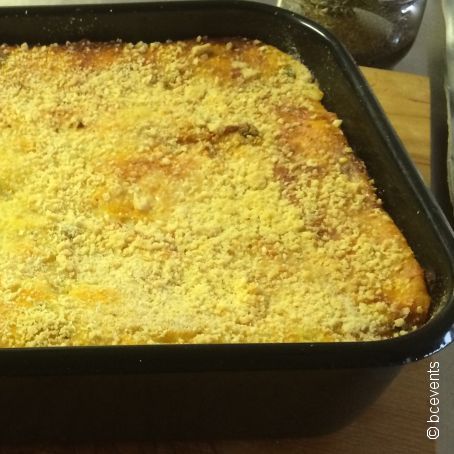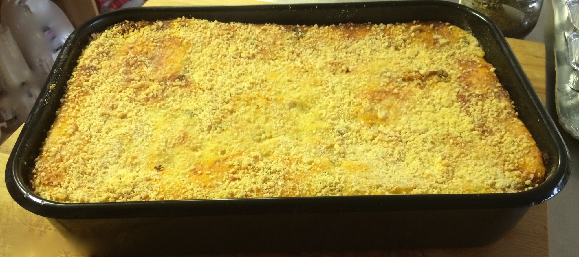 ora preparate la vostra teglia, ungetela con olio, e stendete il primo strato del vostro impasto di patate , non troppo alto, poi procedete versando il sughetto su tutto il primo strato, e continuate , coprite ancora con l'altro impasto .alla fine potete mettere un goccio d'olio e del pane grattuggiato .