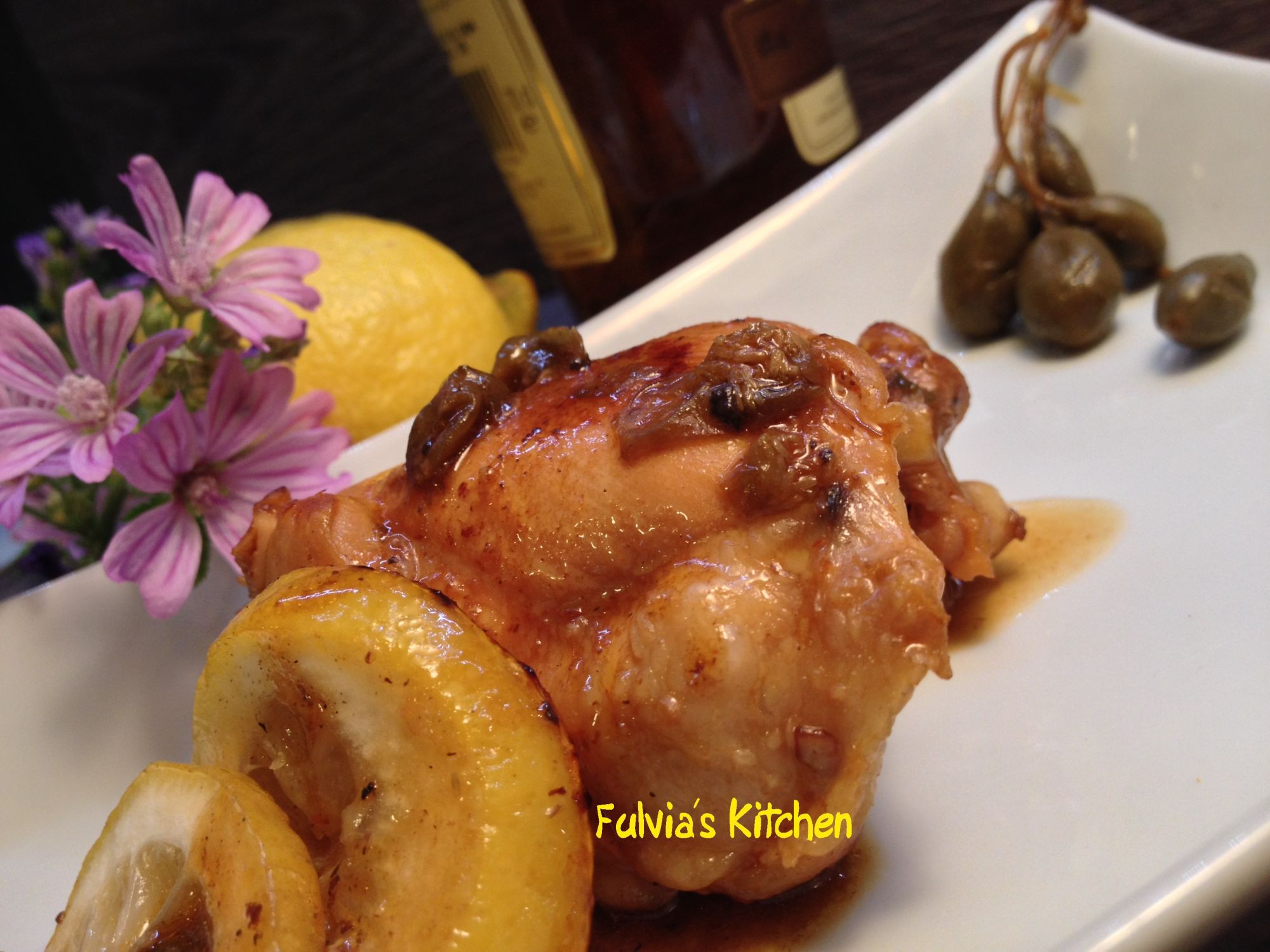 Scaldate la padella e aggiungeteci le sovracosce di pollo, facendole rosolare da tutte le parti, quindi aggiungete le fette di limone e i capperi, il timo e pepate.
